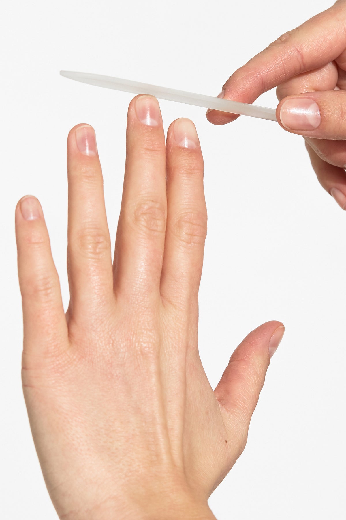 Zorg ervoor dat je nagels droog zijn voordat je begint met vijlen, vochtige nagels zijn gevoeliger. Beweeg de vijl voorzichtig over het uiteinde van de nagel met lichte druk, steeds in een richting naar het midden van de nageltop. Begin aan een zijde, herhaal aan de andere kant en werk af met de nagelrand.