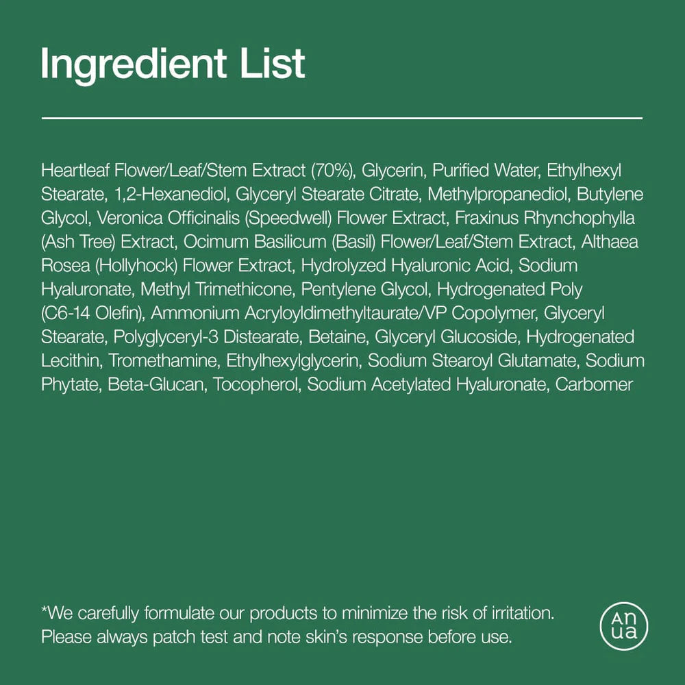 Houttuynia Cordata Extract (70%), Glycerin, 1,2-Hexanediol, MethylTrimethicone, Ethylhexyl Stearate, Butylene Glycol, Hydrogenated Poly(C6-14 Olefin), Polyglyceryl-3 Distearate, Fraxinus Rhynchophylla Extract, Ocimum Basilicum (Basil) Flower/Leaf/Stem Extract, Ulmus Davidiana Root Extract, Amaranthus Caudatus Seed Extract, Hydrogenated Lecithin, Sodium Hyaluronate, Glyceryl Glucoside, Water, Glyceryl Stearate, Trehalose, Arginine, Carbomer, Glyceryl Stearate Citrate, Sodium Stearoyl Glutamate, Glucose, Disodium Edta, Betaine, Hydrolyzed Hyaluronic Acid,