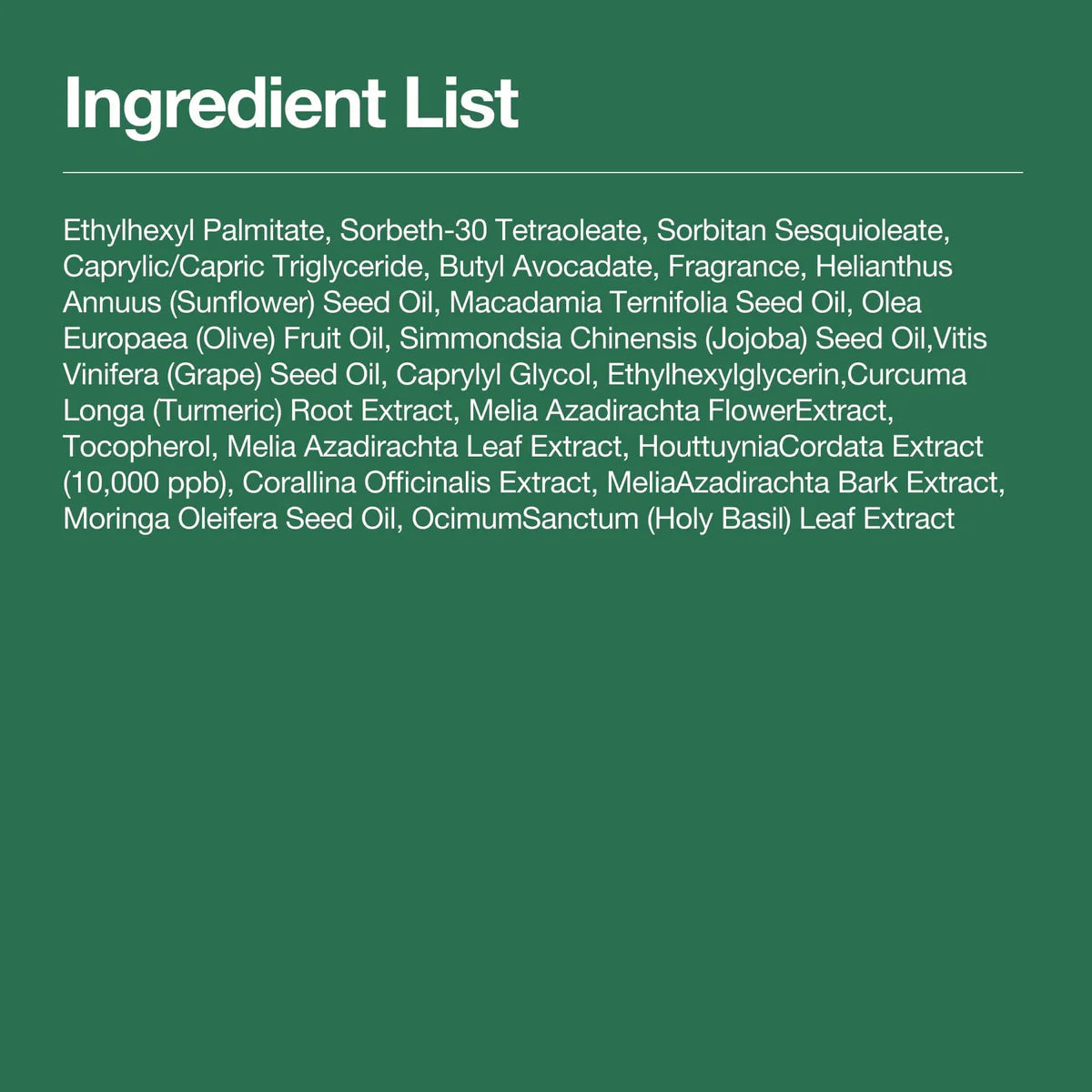 Ethylhexyl Palmitate, Sorbeth-30 Tetraoleate, Sorbitan Sesquioleate, Caprylic/Capric Triglyceride, Butyl Avocadate, Fragrance, Helianthus Annuus (Sunflower) Seed Oil, Macadamia Ternifolia Seed Oil, Olea Europaea (Olive) Fruit Oil, Simmondsia Chinensis (Jojoba) Seed Oil, Vitis Vinifera (Grape) Seed Oil, Caprylyl Glycol, Ethylhexylglycerin, Curcuma Longa (Turmeric) Root Extract, Melia Azadirachta Flower Extract, Tocopherol, Melia Azadirachta Leaf Extract, Houttuynia Cordata Extract, Corallina Officinalis Extract, Melia Azadirachta Bark Extract, Moringa Oleifera Seed Oil, Ocimum Sanctum Leaf Extract
