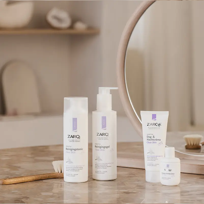Zarqa Reinigingsgel Clear Skin is een diepreinigende, milde reinigingsgel die tot diep in de poriën overtollig talg en vuil verwijdert. Het helpt mee-eters en puistjes te voorkomen, terwijl de natuurlijke antibacteriële bescherming van de huid wordt ondersteund. Dankzij de Dode Zeemineralen heeft de gel een extra zuiverende werking en zorgt het voor een mooie, stralende huid. Geschikt voor alle huidtypen, in het bijzonder de vette en/of onzuivere huid, maar ook zacht genoeg voor de meest gevoelige huidtypen én het lichaam.